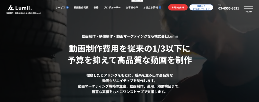 | 株式会社Lumii | ・認知獲得 ・採用 | ・リーズナブルな動画制作:29万円 ・キャスト・スタジオなしの動画制作:30万円~49万円 ・キャスト・スタジオを手配した高クオリティな動画制作:50万円~99万円 ・CGなどを活用したテレビCMクオリティの動画制作:100万円~ ※詳細要相談 | ・徹底したヒアリング ・高品質かつ幅広いジャンルへの対応 |