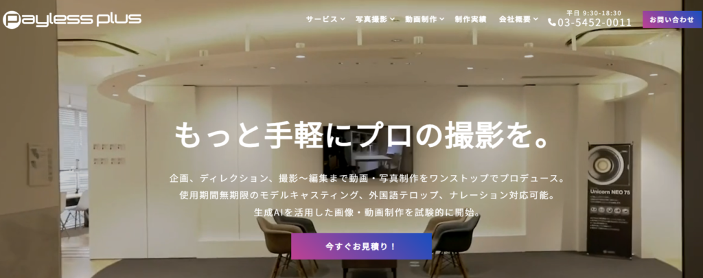 | ペイレスイメージズ株式会社 | ・販売促進 ・認知度向上 | ・撮影半日(4時間内)¥80,000〜 ・撮影1日(8時間内)120,000円〜 ※詳細要相談 | ・豊富な経験に基づいたノウハウがある ・分かりやすい価格体系 |