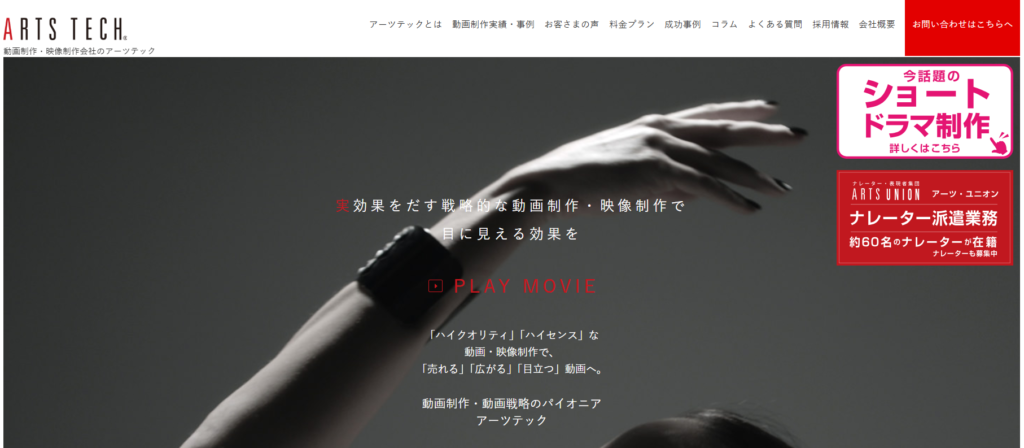 | アーツテック | ・マーケティング ・ブランディング | ・シンプルクオリティ動画プラン:30万円〜 ・テレビ番組クオリティ動画プラン:50万円〜 ・テレビCMクオリティ動画プラン:100万円〜※詳細要相談 | ・高い対応力がある ・動画戦略に強みがある |