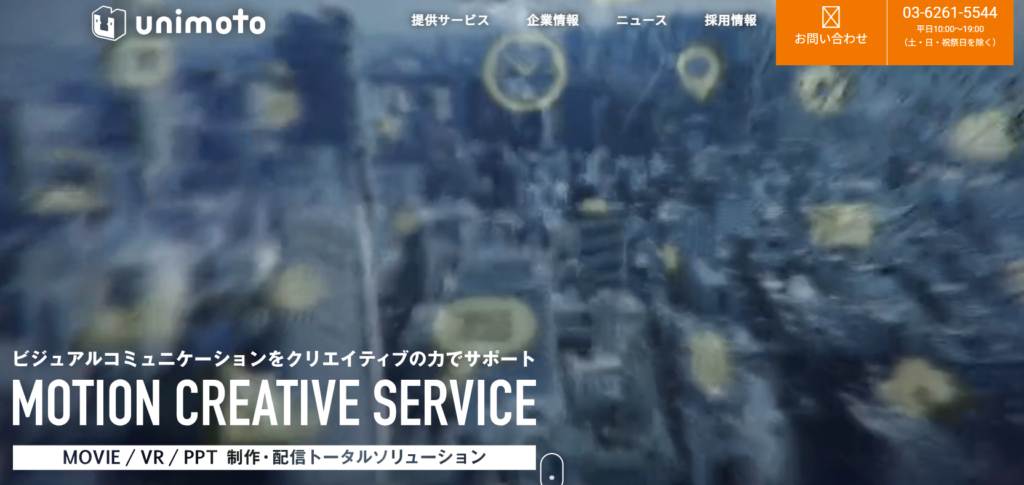 | ユニモト | ・採用 ・企業・施設紹介 | ・ライトプラン:20~35万 ・スタンダードプラン:50~80万 ・プレミアムプラン:100~150万 ・ハイグレードプラン:250万~ ※詳細要相談 | ・360VR動画が得意 ・低コストながらハイクオリティの品質 |